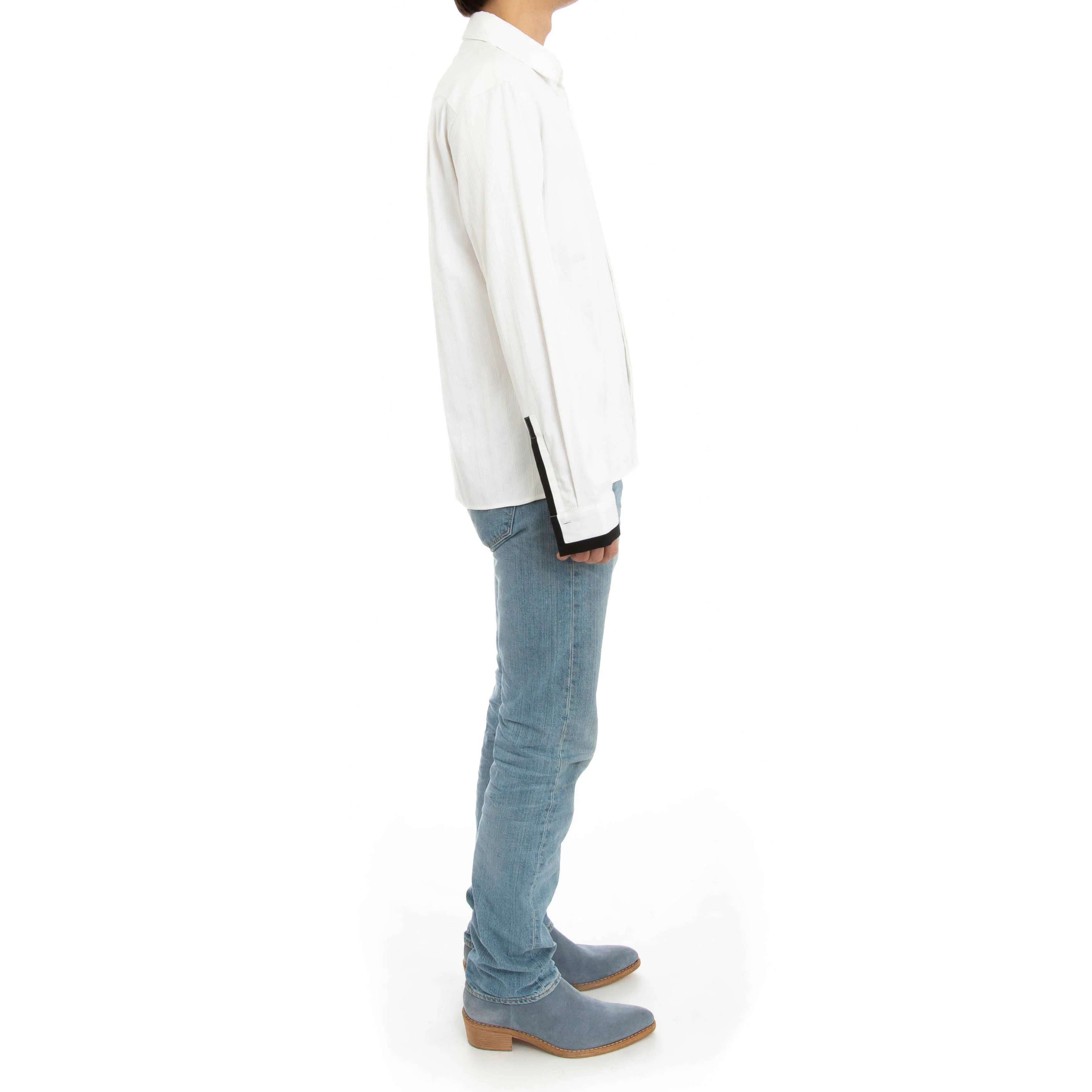 This black and white shirt comes in Haider's signature tailored cut which he uses for shirts in many of his collections. It features the collection's signature contrast on the sleeve and beautifully tailored fit that can easily be dressed up, while also being a staple for any casual look.