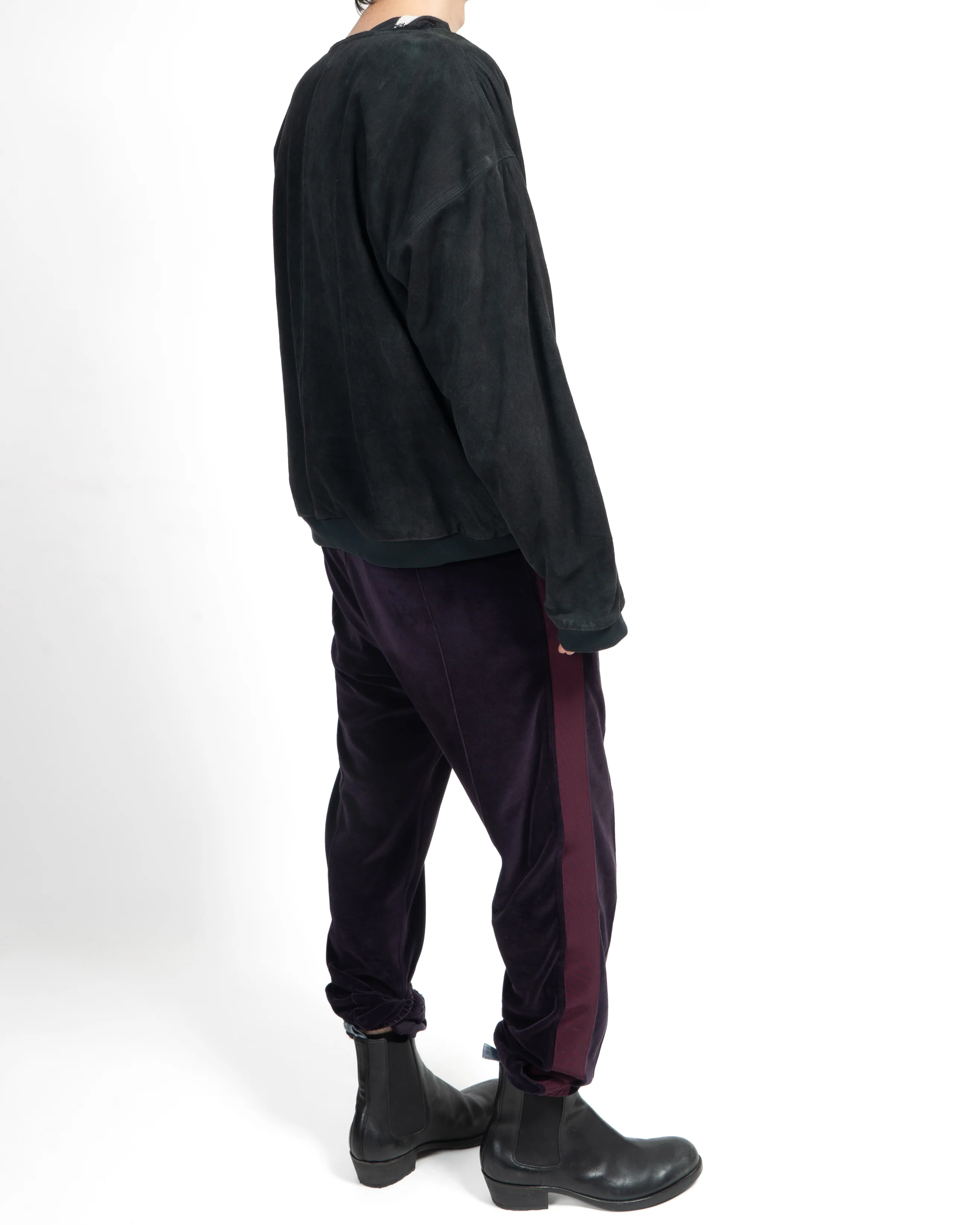 The silhouette is distinctly oversized, featuring dropped shoulders for a relaxed look. A seam runs along the front and back, connecting the suede patches, highlighting the artisanal craftsmanship. The waistband and cuffs are constructed from classic Perth cotton, offering a soft contrast to the suede’s texture.