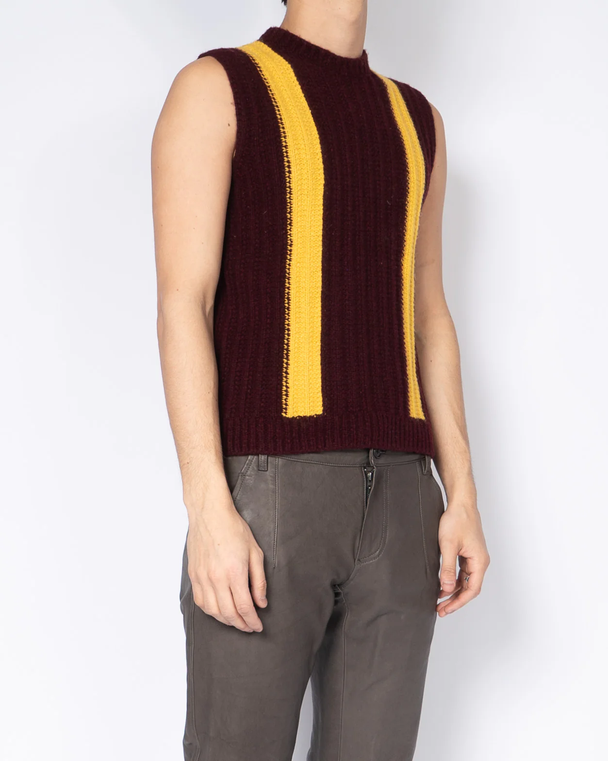 This wool vest was part of the first Raf Simons collection at CK. It features one of the collection's signature colour combinations, the burgundy and yellow. This particular piece is an unreleased prototype that we got from a designer of the now closed 205W39NYC label.