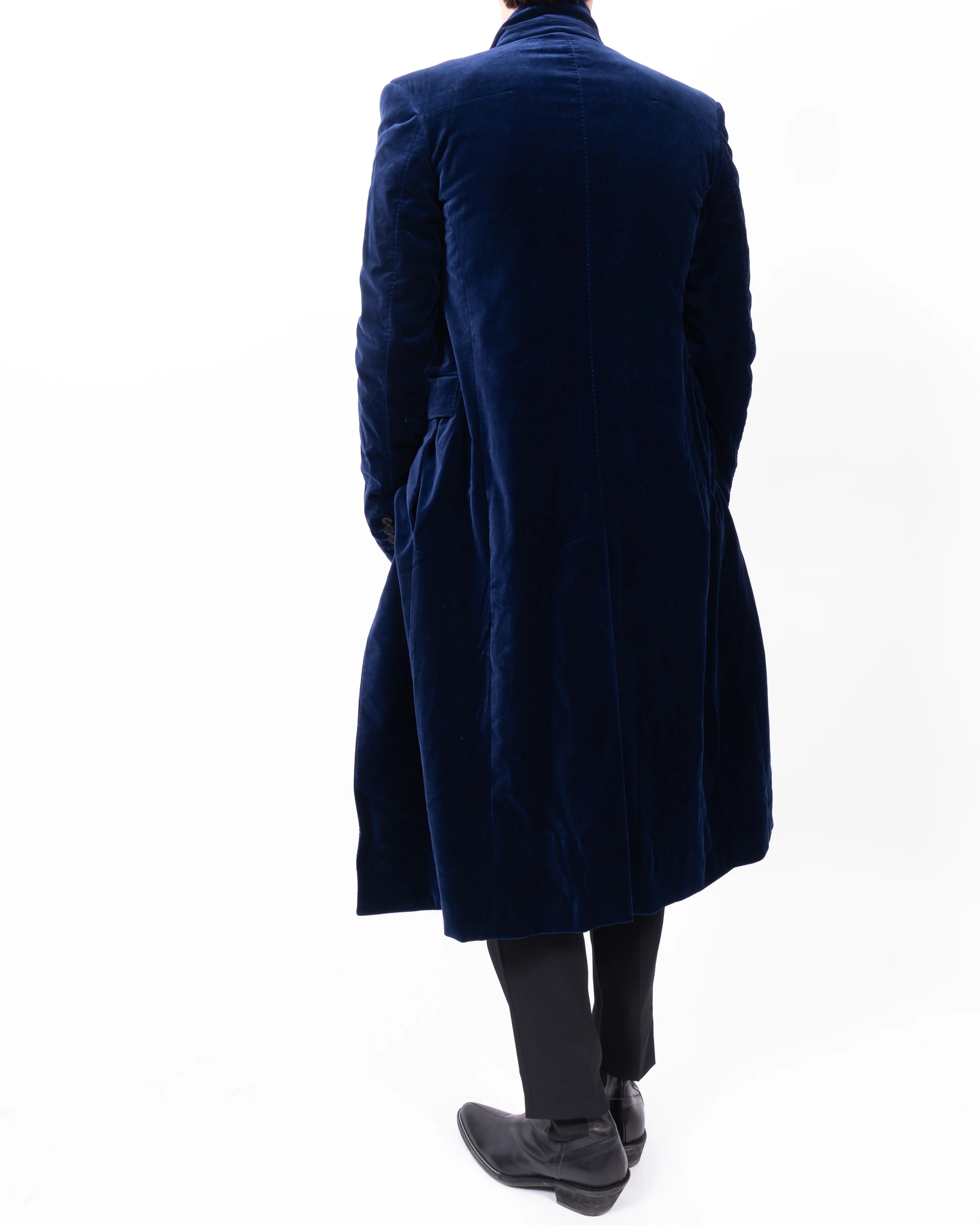 This exquisite coat was featured on the Runway of Haider Ackermann’s Fall/Winter 2020 Runway Show. This Piece perfectly showcases the designer’s signature touch for classic menswear. Crafted from a luxurious deep blue velvet, the double-breasted design exudes sophistication and luxury. The elongated silhouette is enhanced by its structured shoulders, peak lapel collar, and sharp lines, creating a refined look. Detailed with black buttons and a single chest pocket, the coat is perfect for a formal occasion or as a statement piece.