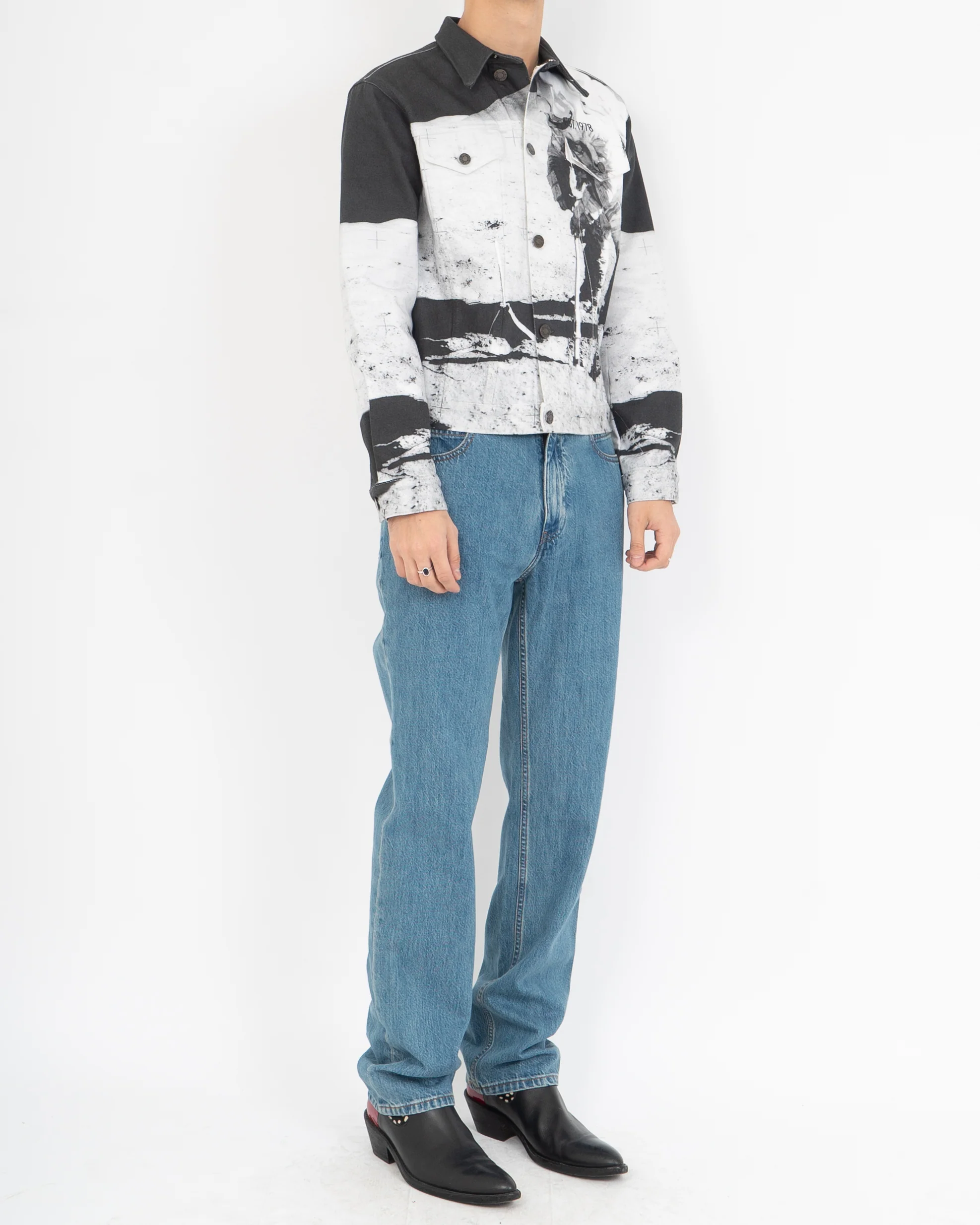 This full printed denim jacket from Calvin Klein’s Est- 1978 collection features a allover print of the Moon Landing in a black and white colorway. It was released alongside other beautifully printed denim pieces but this was definitely the most rare one out of all of them. With hardly any retailer having it in stock and only a small number of produced pieces, this definitely comes out as one of our rarest Calvin Klein by Raf pieces.